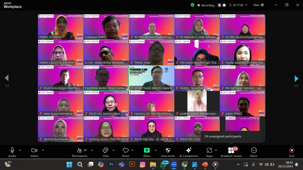 Workshop Online Penyusunan Standar Audit SPI-RS bagian 1. (Kamis, 16 Desember 2021), 95 peserta.